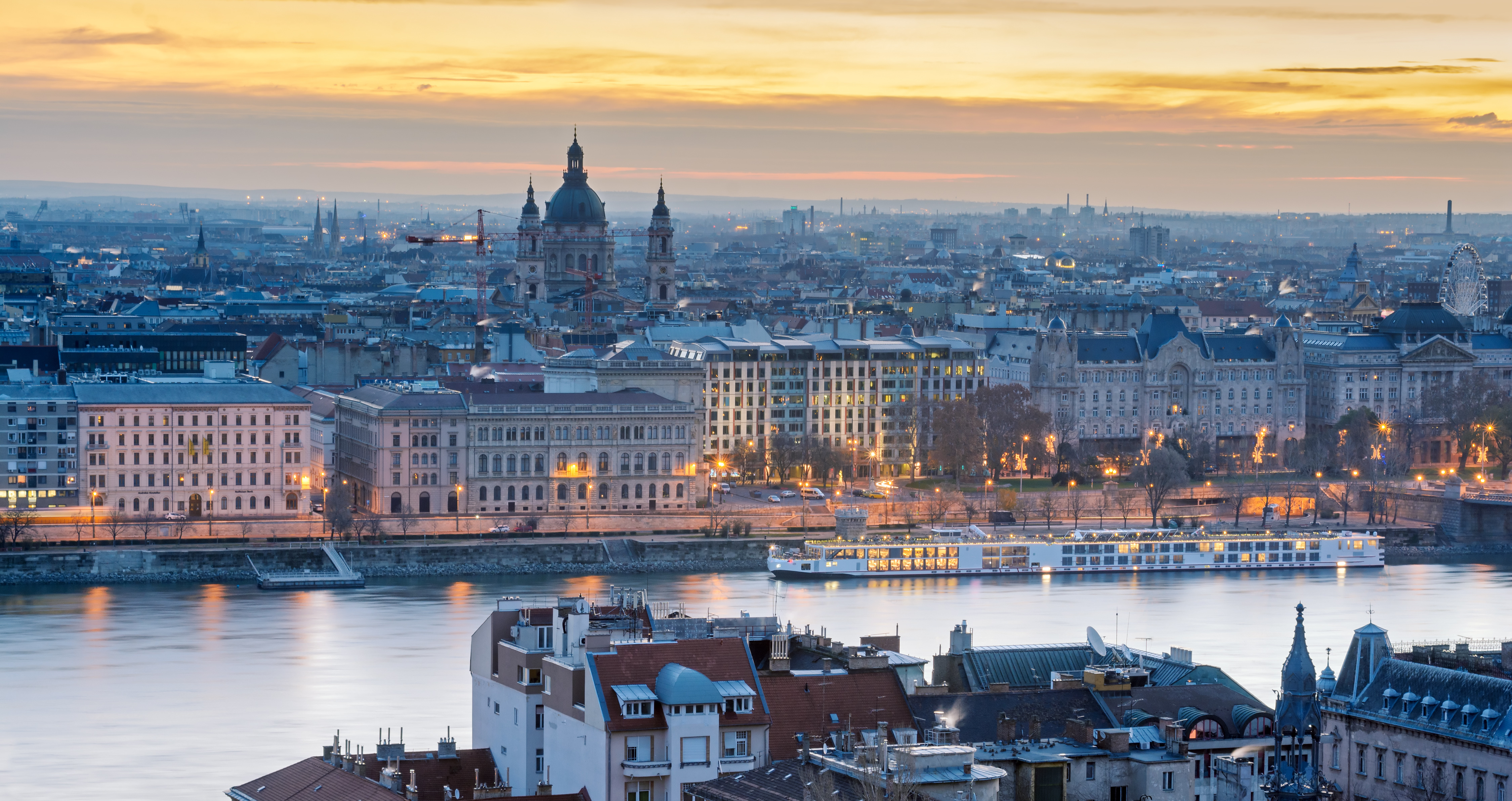 Pest riverfront of Budapest, st. Stephen’s basilica domes, cruise ship at pier